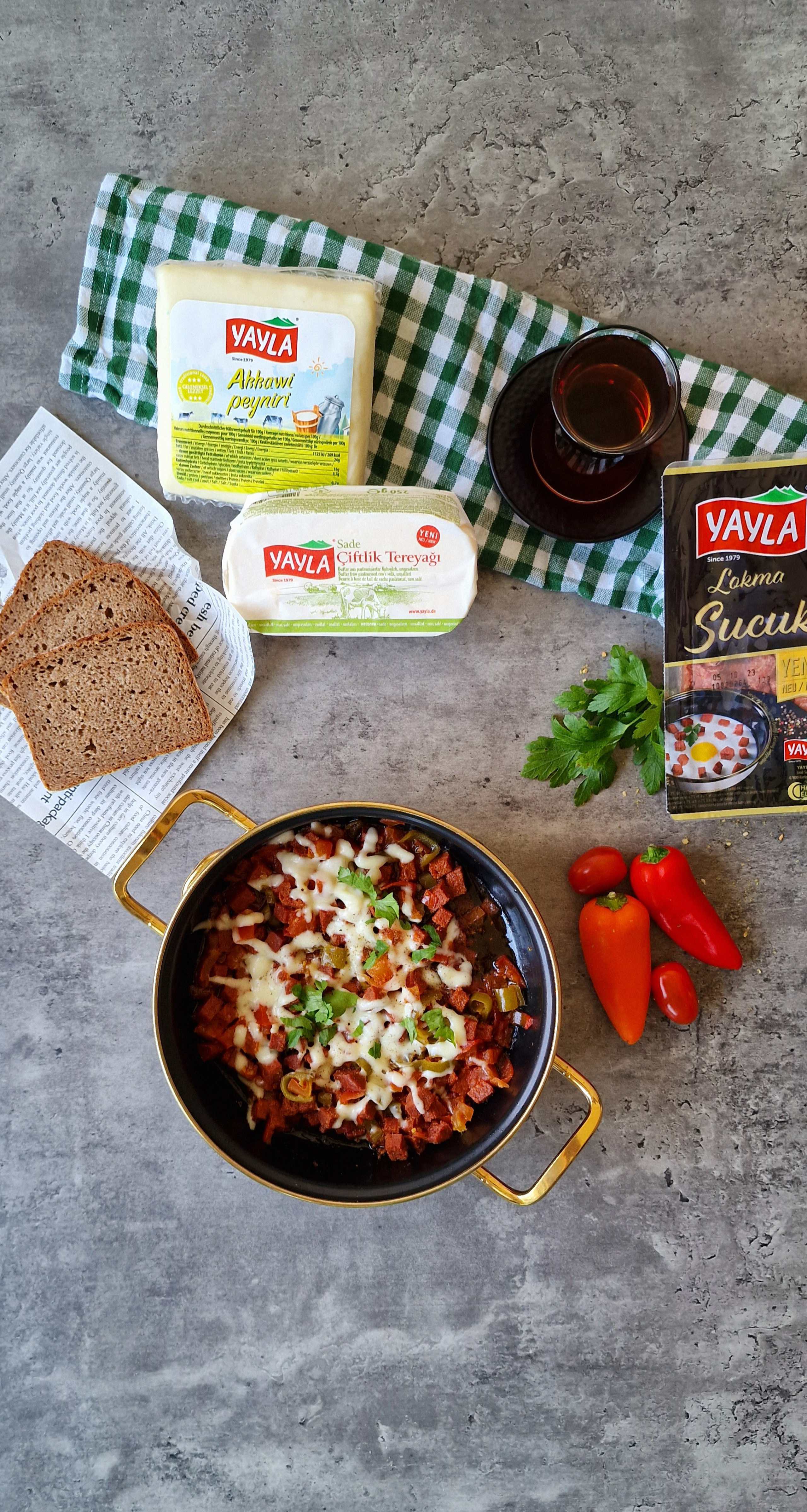 Szakszuka z wegańską kiełbaską sucuk.