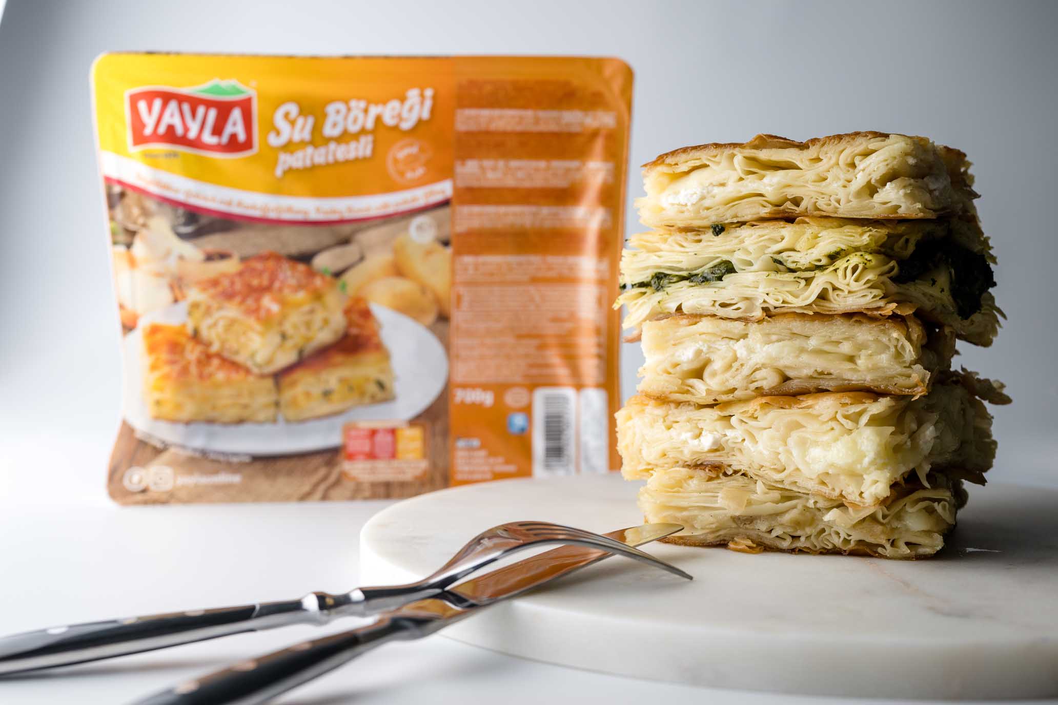 Weizenmehl, Wasser, Spinatfüllung 21% (Spinat 71%, Zwiebel, Salz), Sonnenblumenöl, Eipulver, Salz, Butter, Konservierungsstoff E202, E201, E200, Emulgator E471, Antioxidans E330, Maisstärke.
